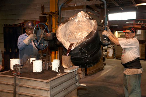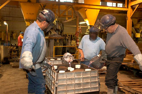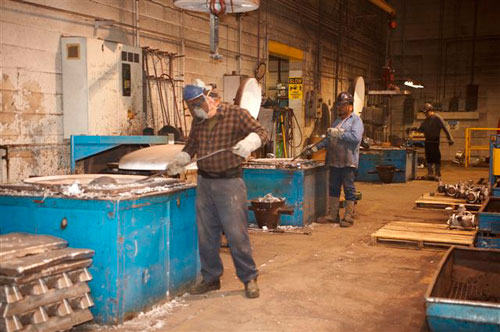 We produce castings from any requested alloy offering in-house stock of 10 most common materials. Molten metal pouring capacity is approx. 20000 lbs per shift using nine electric resistance furnaces ranging is size from 800 to 1500lbs. Each furnace is fully accessible to an overhead gantry system providing Rotary Degassing to the melt as well as metal transfer pumping when required.